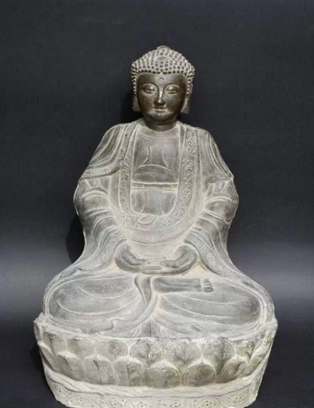 明代佛坐像,旧藏,黄铜质,通高72.5厘米,宽45厘米,作坐姿。佛螺髻,双耳硕垂,面相丰圆,额白毫相,细棱弯眉,大眼修鼻,嘴角微笑,颈戴项圈,双肩披巾,身着双领袈裟,双手施禅定印,结跏趺坐于仰莲座上。披巾,袈裟花边,饰缠枝花卉纹,底上莲瓣饰双线宝相花,座下饰水波纹及缠枝花卉纹。座后铸题记,楷书残存"大明国平凉□泾州原店……"等90字。此像为研究明代佛造像提供了珍贵的实物资料。