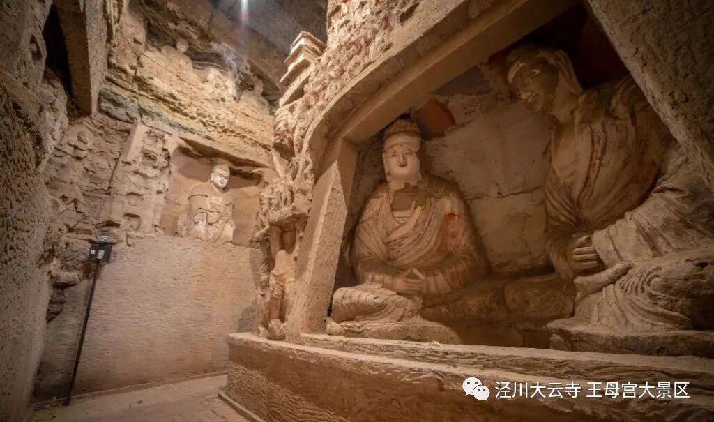 王母宫石窟依山而建,开凿于北魏时期,距今已有1500多年历史,石窟因开凿在王母宫山下而得名,是全国重点文物保护单位。窟内平面呈“回”字形,外有三层楼窟檐,窟高11米,宽12.6米,深10米,中心柱四周及窟壁三面雕有佛像200余尊,有大小佛龛22个。中心柱正面塑有佛像一尊,高约4米,泥塑石胎,体态丰满,为唐代作品。窟内每壁造像三层,百余尊,是我国古“丝绸之路”上的名窟之一。