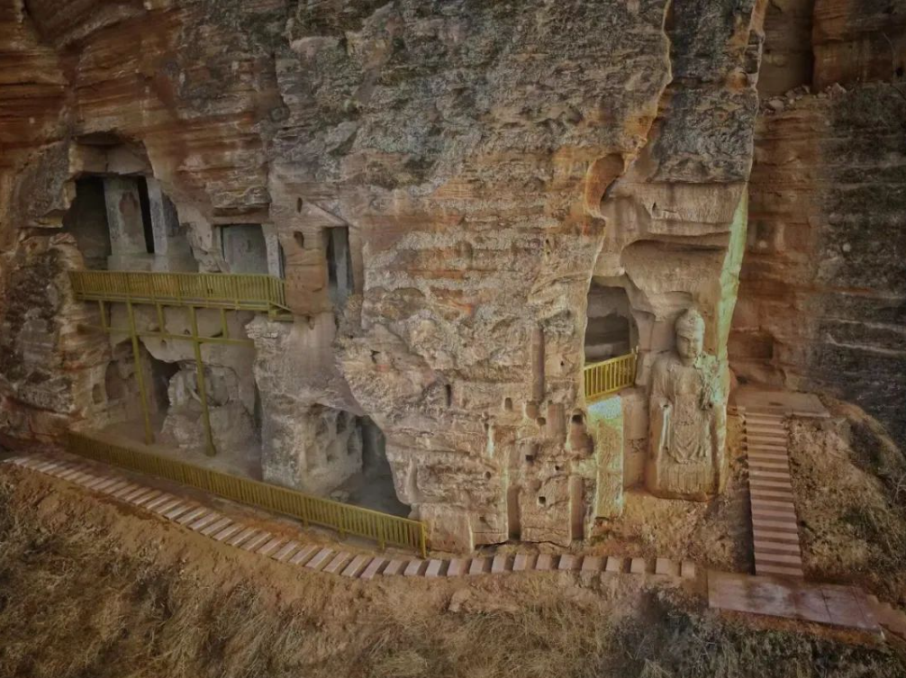 “百里石窟长廊”主要开凿于北魏年间,后世多有新开洞窟并持续修复,因其石窟多开凿于泾河两岸的红砂岩壁上,质地相对松软,风化、毁坏严重,现存有造像450余尊,壁画总合计470多平方米。