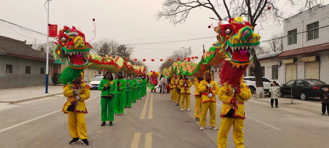 在喧天的锣鼓声中,村民们身穿喜庆艳丽的服装,踏着喜庆的鼓点、和着欢快的节拍相继登场。尽管气温寒冷,但是丝毫不影响社火队的演出。欢腾的金龙时而迎珠戏舞,时而较颈戏斗,威武的雄狮前后跳跃,欢快的旱船来回穿梭,火红的秧歌翩翩起舞,喜庆的锣鼓铿锵有力、催人奋进,欢快的舞蹈活力迸发、激情四射,处处弥漫着欢乐、祥和的氛围。