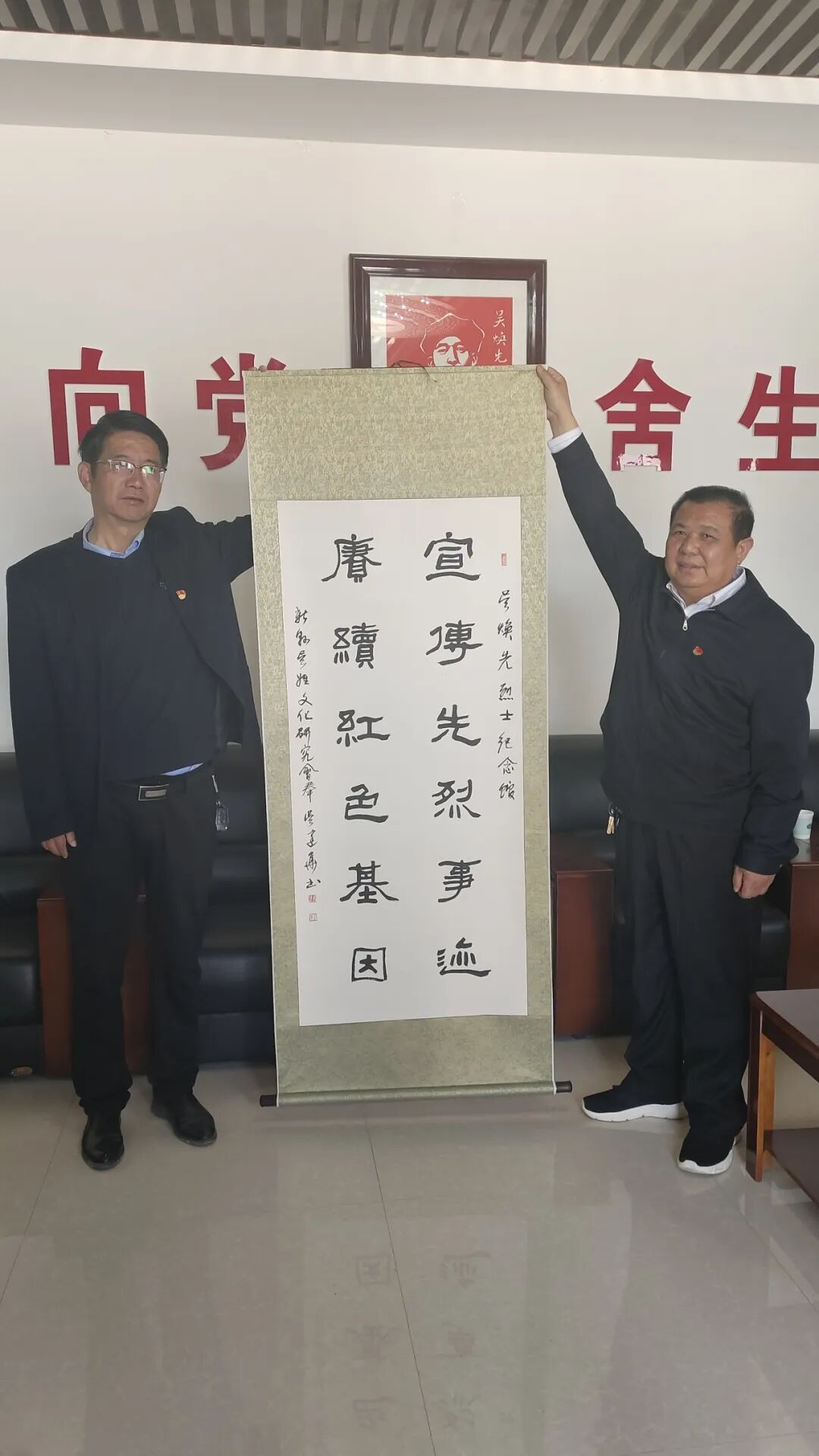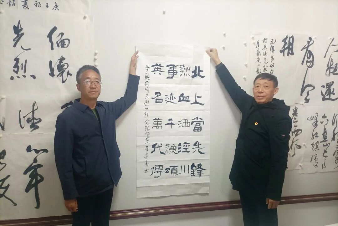 随后,双方在烈士陵园会议室进行座谈交流。朱银柱首先对代表团一行的到来表示热烈欢迎,简要介绍了我馆近期为在清明节缅怀吴焕先烈士而开展的各项工作情况,并代表我馆向代表团赠送了文创产品。吴世友代表河南新县吴姓文化研究会向我馆近年来为宣传吴焕先烈士的英雄事迹和革命精神开展的各项工作、做出的各项努力表示衷心的感谢。吴建华带来自己精心创作的两幅书法作品赠送我馆收藏,并怀着激动的心情现场赋诗写下参观纪念馆后的感想。
