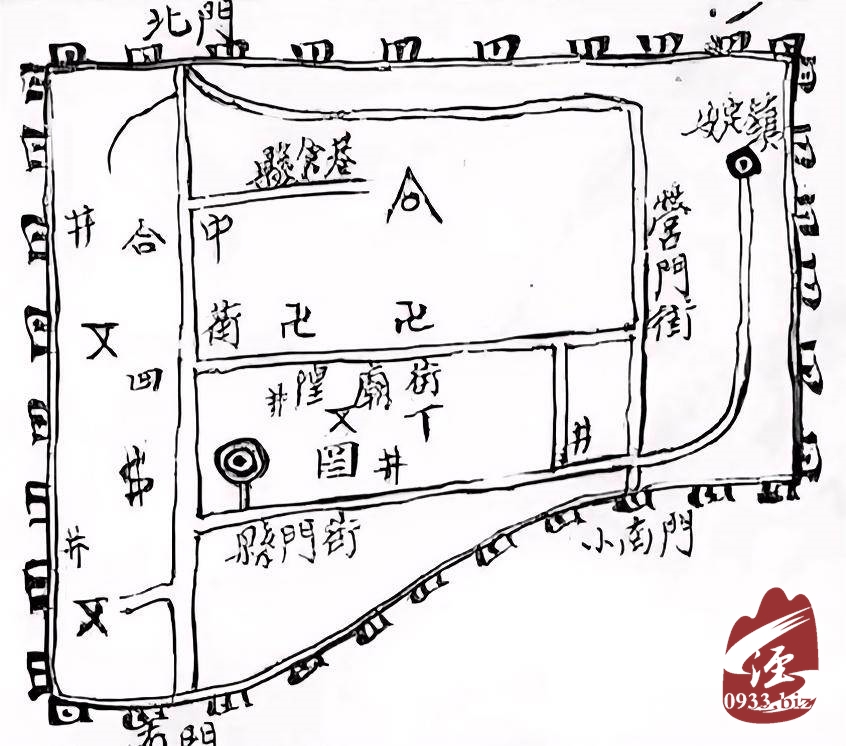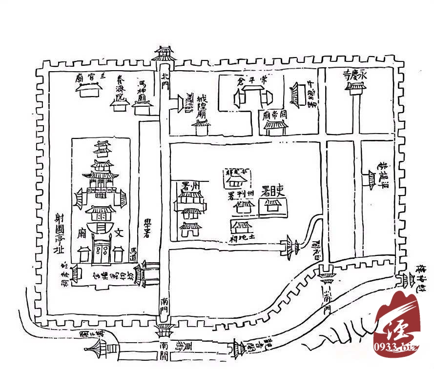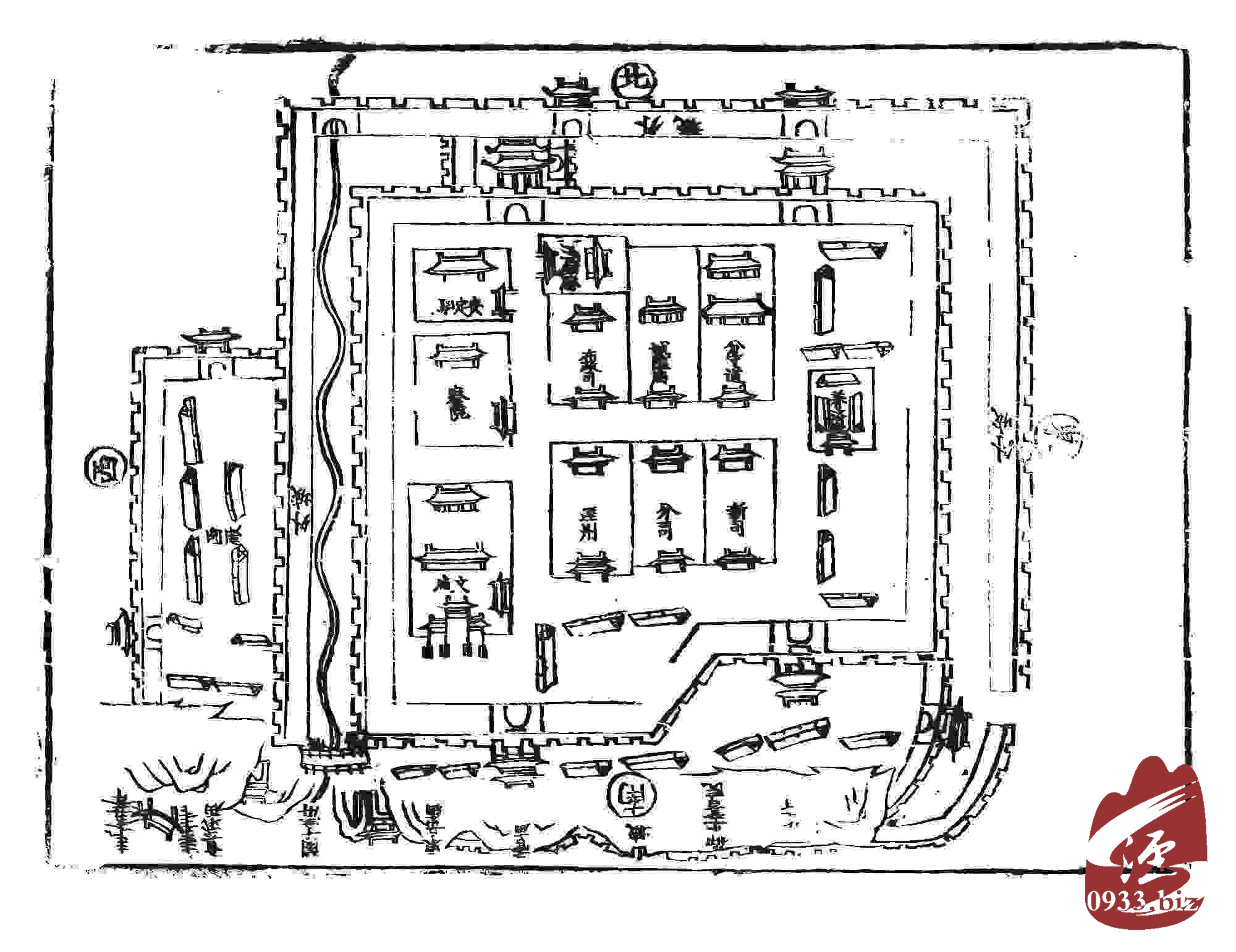 开城门三处:北门“永宁门”、南门“承熙门”、东南门(小南门)“东盛门”。