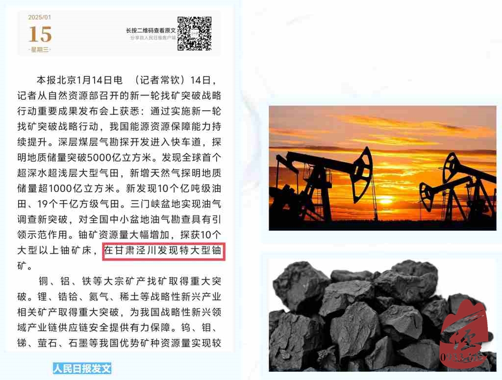 泾川县境内煤炭资源预估储量30亿吨,主要煤类为不粘煤,原煤发热量6700大卡左右,是优质环保动力煤和化工用煤;石油远景资源量1.8亿吨,由中石化华北油气分公司、中石油长庆油田分公司勘探开发,日均生产原油77吨;鄂尔多斯盆地泾川地区是全球首次在风成砂岩分布区发现的特大型铀矿。