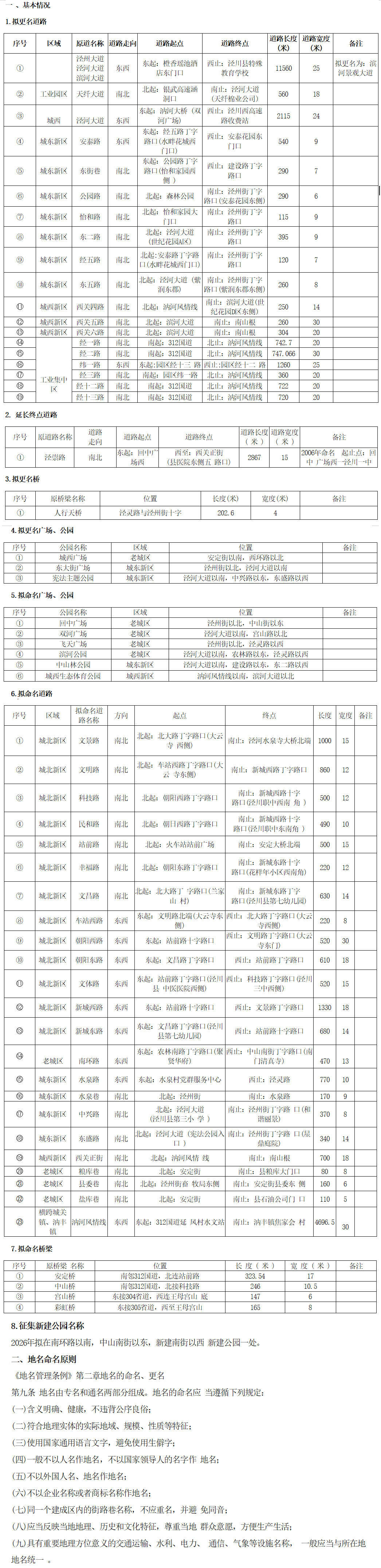 为加快推动泾川县城区道路、公园、桥梁名称管理规范化、标准化,根据国务院《地名管理条例》有关规定,县民政局组织工作专班拟对城区部分道路、公园、桥梁进行命(更)名,现面向社会和各有关单位广泛征求意见。请将意见建议于10月17日前通过电话、邮箱或信函的形式反馈至泾川县民政局。