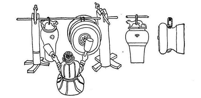 在漫长的冷兵器时代,击鼓、吹角、鸣金、錞于等用于指挥军队进退。我国古代有“击鼓鸣金”之说,击鼓为部队向前冲锋,鸣金则为部队向后撤退。《淮南子·兵略训》有“两军相当,錞鼓相望”的记载。《国语·晋语五》:“战以錞于,丁宁,儆其民也。”韦昭注:“錞于,形如碓头,与鼓角相和。”这些文献资料向我们展示了錞于作为军中乐器的使用情况。