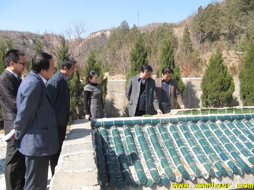 完县长仔细查看浮雕墙顶部琉璃瓦损坏情况。县旅游局局长杨志锋、景区管理局局长苏丽红随同