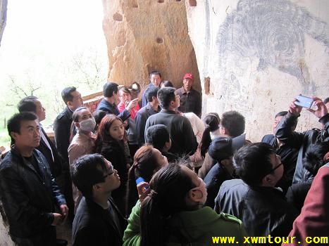 【图-4】大家在认真欣赏罗汉洞石窟的残存壁画