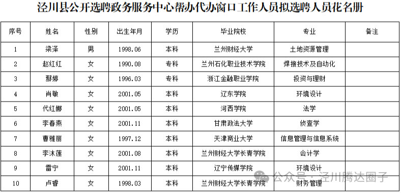 泾川县公开选聘政务服务中心帮办代办窗口工作人员拟选聘人员的公示