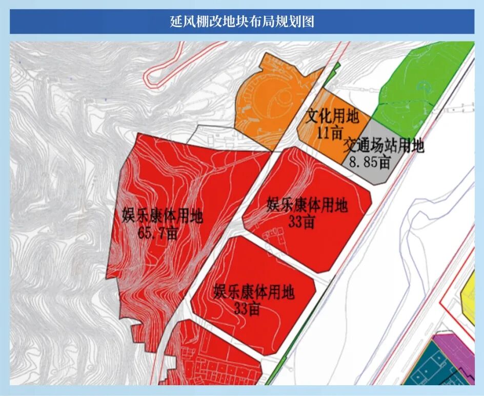 用地性质、面积:规划用地151.55 亩。其中:文化用地11亩,娱乐康体用地131.7亩,交通场站用地8.85亩。