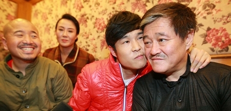 王小利(左)等人接受媒体采访,小沈阳 (中)对师傅赵本山(右)表现亲昵。